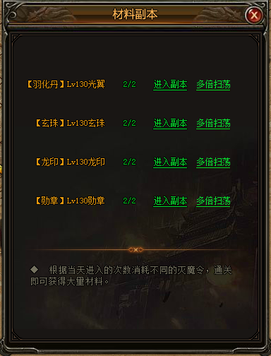 除了等级限制,每次进入材料副本需要消耗灭魔令。在线每半个小时自动获得4个灭魔令,不过如果你很着急的话,不妨去商城转转。