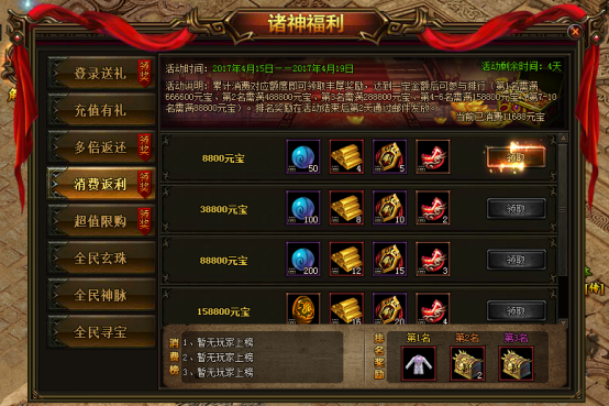 活动说明:活动期间内累计消费对应额度可获得丰厚奖励,达到一定金额则可参与排名(第1名需满666600元宝、第2名需满488800元宝、第3名需满288800元宝、第4-6名需满158800元宝、第7-10名需满88800元宝)、排名奖励在活动结束后第2天通过邮件发放。