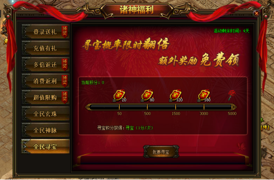 活动说明:活动期间内,寻宝几率翻倍,达到一定次数可获得寻宝令返利,达到最高标准可获得时装卡-浓情玫瑰。