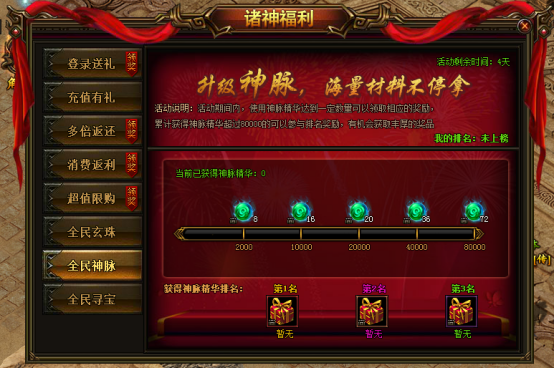 活动说明:活动期间内,使用神脉精华达到一定数量可领取对应奖励,累计获得精华超过80000更可参与排名获得豪华奖励。