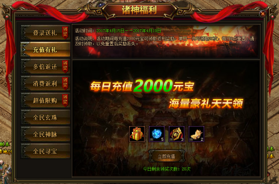 活动说明:活动期间每充值2000元宝可领取返利奖励,单日一共可领取20次,每日0点重置。请及时领取,以免重置后奖励丢失。