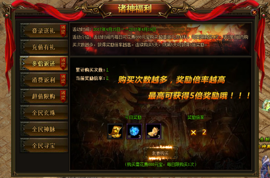 活动说明:活动期间每日可花费888元宝购买超值绑元和材料,每日限购1次,活动期间购买次数越多,获得奖励倍率越高。连续购买5天,则第5天可获得5倍奖励。