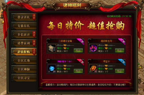 活动说明:活动期间内,每日0点刷新特价珍贵道具,各种超值,不要错过哦。