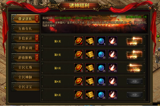活动说明:活动期间每日登陆可领取免费礼包一份,登陆越多礼包越丰厚哦。