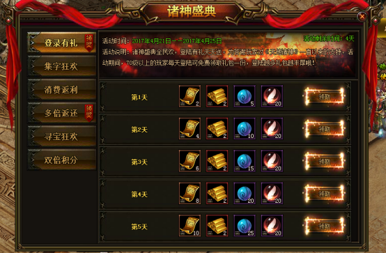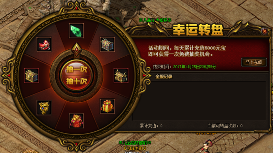 活动说明:活动期间内,每天累计充值5000元宝即可获得一次免费抽奖机会,有几率获得天地晶石、诸神装备等极品奖励。