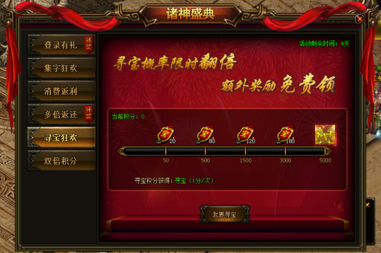 活动说明:活动期间内,寻宝几率翻倍,达到一定次数可获得寻宝令返利,达到最高标准可获得绝版称号-傲视诸神。