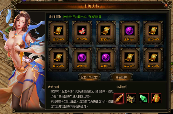 活动说明:活动期间内,玩家可翻取卡牌获得对应材料及装备,“重置卡牌”可更换卡牌奖励。每日0点重置后玩家还可获得3次免费翻牌机会。