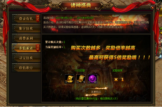 活动说明:活动期间每日可花费888元宝购买超值绑元和材料,每日限购1次,活动期间购买次数越多获得奖励倍率越高。连续购买5天,则第5天可获得5倍奖励。