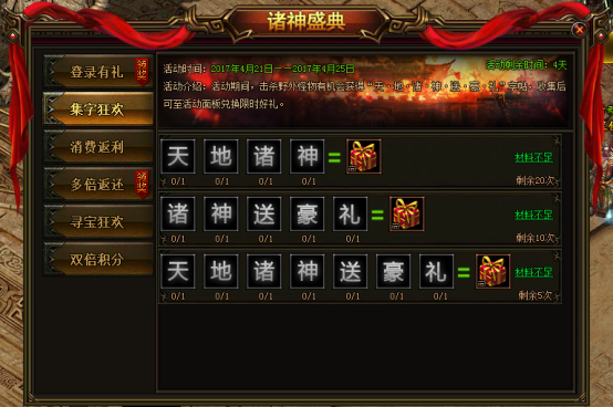 活动说明:活动期间击杀野外怪物有几率获得“天·地·诸·神·送·豪·礼”字帖,集齐对应组合可至活动面板处兑换限时豪礼。