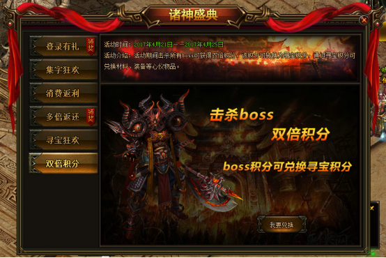 活动说明:活动期间内击杀所有boss可获得双倍积分,该积分可转换为寻宝积分,兑换材料、装备等心仪物品。