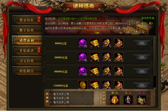 活动说明:活动期间内累计消费对应额度可获得丰厚奖励,满666600元宝还可参与排行,前3名的玩家更可获得天地至尊极品宝箱、绝版时装等超级豪礼。排名奖励将在活动结束后第2天通过邮件发放。