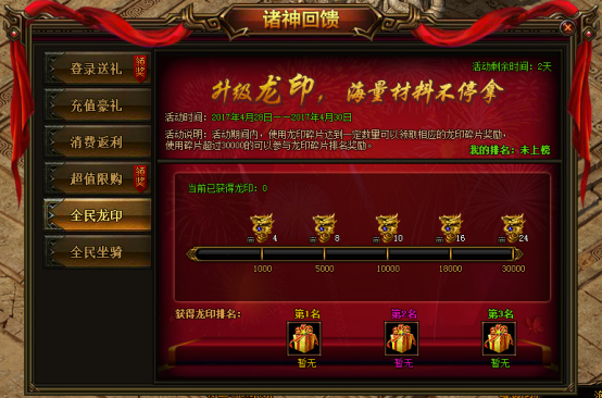 活动说明:活动期间内,使用龙印碎片达到一定数量可领取相应龙印碎片奖励,使用碎片超过30000可以参与排行获得排名奖励。