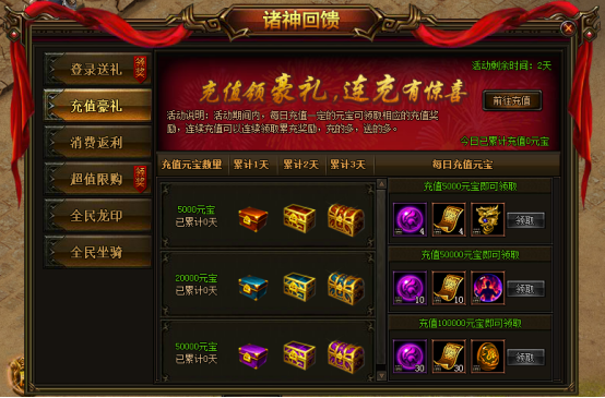 活动说明:活动期间内,每日充值一定元宝可领取充值奖励,连续充值可领取累充奖励,充得多,送得多。