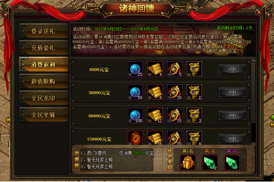 活动说明:活动期间内累计消费对应额度可获得丰厚奖励,达到一定金额后可参与排行(第1名需满666600元宝、第2名需满488800元宝、第3名需满288800元宝、第4-6名需满158800元宝、第7-10名需满88800元宝)。排名奖励将在活动结束后第2天通过邮件发放。