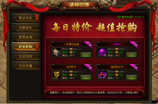 活动说明:活动期间内,每日0点刷新特价珍惜道具,助您轻松升级,战力飞升。