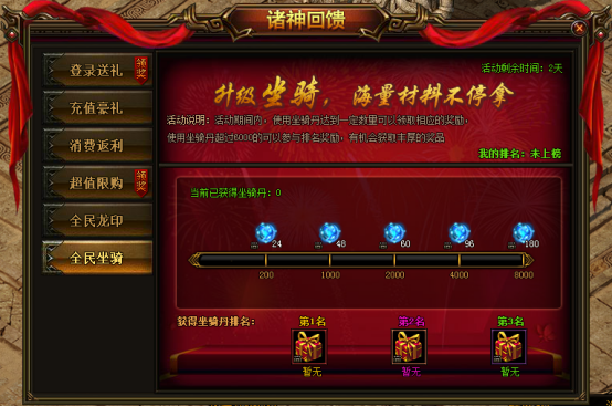 活动说明:活动期间内,使用坐骑丹达到一定数量可领取相应奖励,总量超过6000可参与排名获得豪华排名奖励。