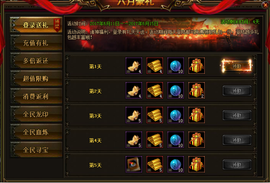 活动说明:活动期间,每日登陆可领取免费礼包一份,登陆越多礼包越丰厚哦。