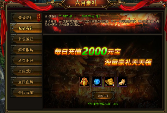 活动说明:活动期间每充值2000元宝可领取返利奖励,单日一共可领取20次,每日0点充值,请及时领取,以免充值后奖励丢失