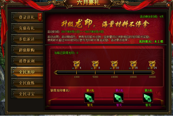活动说明:活动期间,使用龙印碎片达到一定数量可以领取相应的奖励,使用碎片超过30000的可以参与龙印碎片排名奖励,活动零点结束。