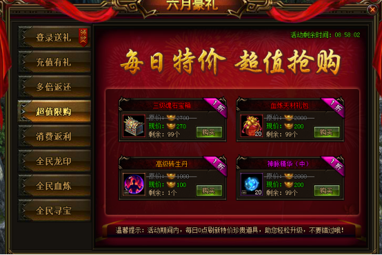 活动说明:活动期间,每日0点刷新特价珍贵道具