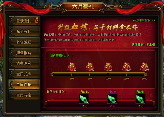 活动说明:活动期间,累积使用血炼材料可以领取额外珍贵道具,达到一定额度还可以参与排行,排行奖励在活动结束第二天通过邮件发放。