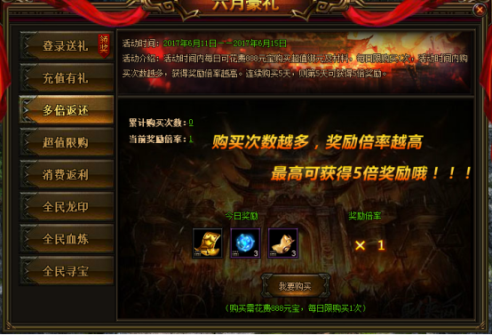 活动说明:活动期间每日可花费888元宝购买超值绑元及材料,每日限购买1次,活动时间内购买次数越多,获得奖励倍率越高,连续5天,则第5天可获得5倍奖励