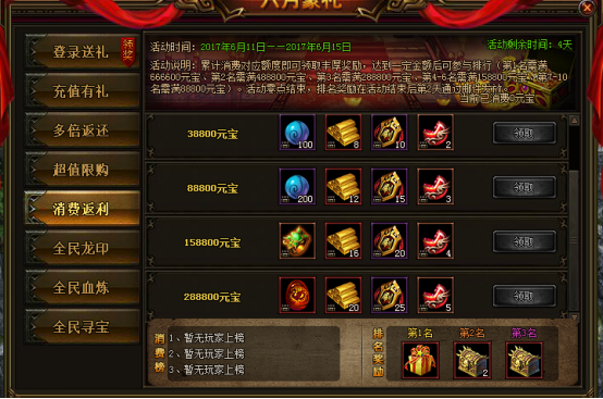 活动说明:累计消费对应额度可领取丰厚奖励,达到一定金额后可参与排行(第一名需满666600元宝,第二名488800元宝,第三名288800元宝,4-6名1588800元宝,7-10名88800元宝)。活动零点结束,排名奖励在活动结束后第二天通过邮件发放。
