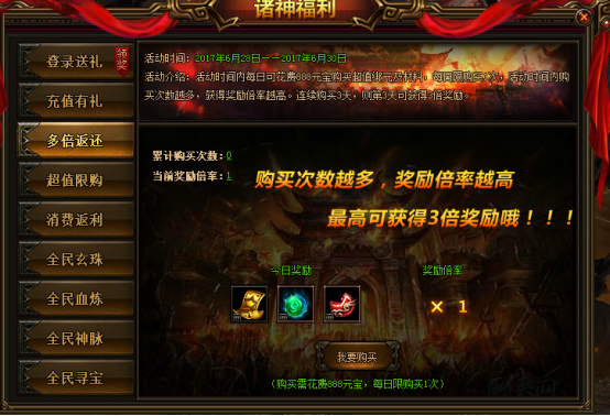活动说明:活动期间,每日可花费888元宝购买超值绑元及其材料,每日限购买1次,活动时间内购买次数越多,获得奖励倍率越高。连续购买3天,则第3天可获得3倍奖励。