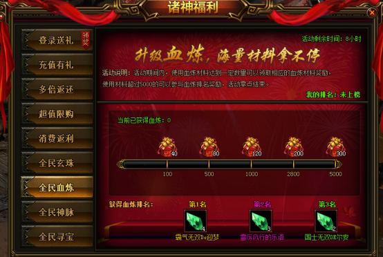 活动说明:活动期间,累积使用血炼材料可以领取额外珍贵道具,达到一定额度还可以参与排行,排行奖励在活动结束第二天通过邮件发放。
