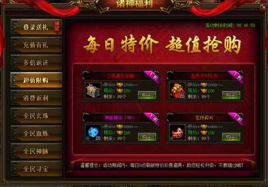 活动说明:活动期间,每日0点刷新特价珍贵道具