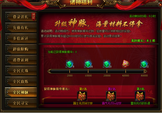 活动说明:活动期间,使用神脉精华达到一定数量可以领取相应的奖励,累计获得神脉精华超过60000的可以参与排行奖励,活动0点结束。