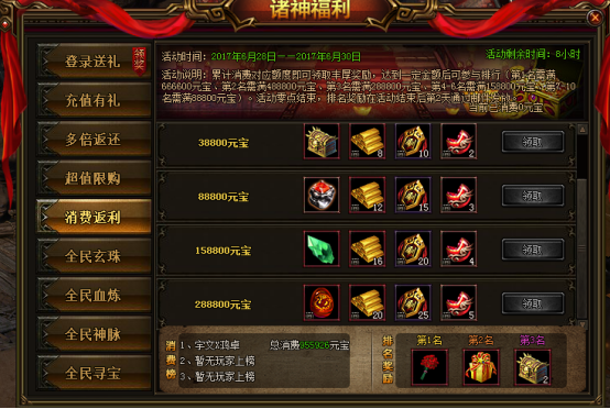 活动说明:累计消费对应额度可领取丰厚奖励,达到一定金额后可参与排行活动零点结束,排名奖励在活动结束后第二天通过邮件发放。