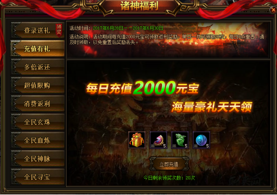 活动说明:活动期间每充值2000元宝可领取返利奖励,单日一共可以领取20次,每日0点重置。请及时领取,以免充值后奖励丢失。