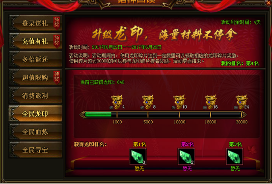 活动说明:活动期间,使用龙印碎片达到一定数量可以领取相应的奖励,使用碎片超过30000的可以参与龙印碎片排名奖励,活动零点结束。