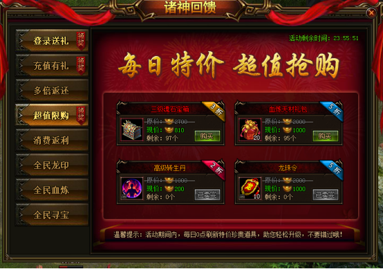 活动说明:活动期间,每日0点刷新特价珍贵道具