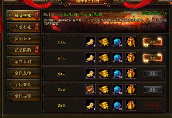 活动说明:活动期间,每日登陆可领取免费礼包一份,登陆越多礼包越丰厚哦。