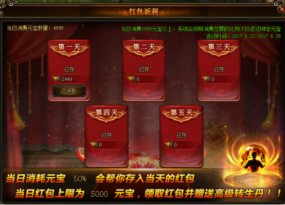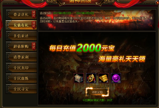 活动说明:活动期间每充值2000元宝可领取返利奖励,单日一共可以领取20次,每日0点重置,请及时领取,以免充值后奖励丢失。