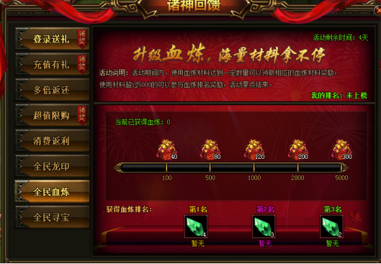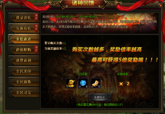 活动说明:活动期间每日花费888元宝购买超值绑元及材料,每日限购买1次,活动时间内购买次数越多,获得奖励倍率越高,连续购买5天,则第5天可获得5倍奖励。