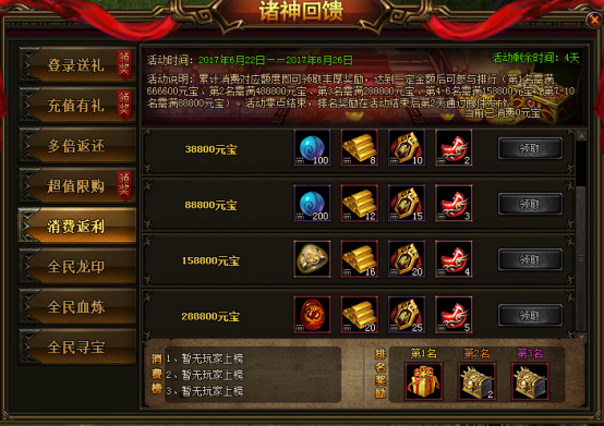 活动说明:累计消费对应额度可领取丰厚奖励,达到一定金额后可参与排行活动零点结束,排名奖励在活动结束后第二天通过邮件发放。