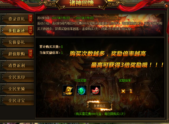 活动说明:活动期间,每日可花费888元宝购买超值绑元及其材料,每日限购买1次,活动时间内购买次数越多,获得奖励倍率越高。连续购买3天,则第3天可获得3倍奖励。