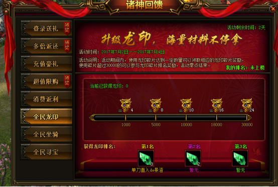 活动说明:活动期间,使用龙印碎片达到一定数量可以领取相应的奖励,使用碎片超过30000的可以参与龙印碎片排名奖励,活动零点结束。