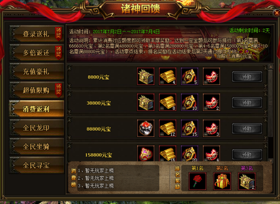 活动说明:累计消费对应额度可领取丰厚奖励,达到一定金额后可参与排行活动零点结束,排名奖励在活动结束后第二天通过邮件发放。