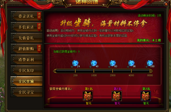 活动说明:活动期间,累积使用坐骑丹可以领取额外珍贵道具,达到一定额度还可以参与排行,排行奖励在活动结束第二天通过邮件发放。