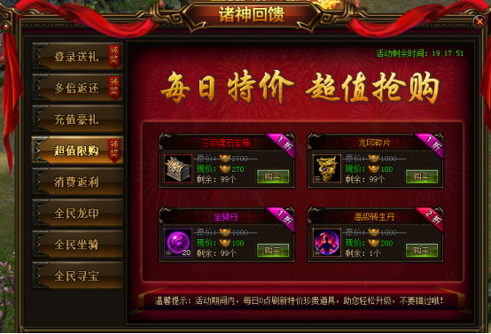 活动说明:活动期间,每日0点刷新特价珍贵道具