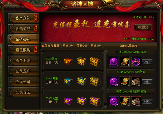 活动说明:充值领豪礼,连充有惊喜
