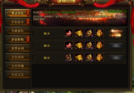 活动说明:活动期间,每日登陆可领取免费礼包一份,登陆越多礼包越丰厚哦。