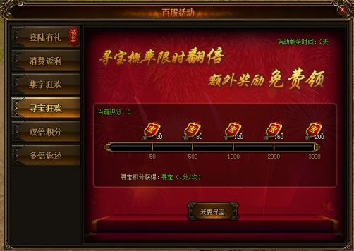 活动内容:活动期间寻宝概率限时翻倍,达成一定次数还可额外领取大量寻宝令牌