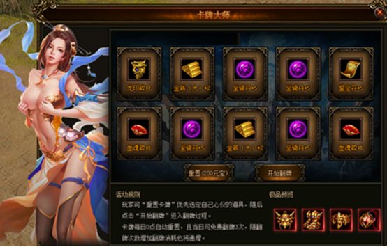 活动说明:活动期间玩家每日可免费3次翻牌抽取心仪卡牌,也可以重置当前卡牌挑选心仪道具后进行翻牌抽取奖励。