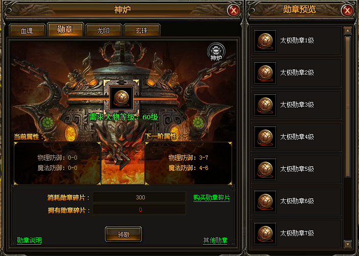 玩家可通过点击主界面的神炉图标进入勋章领取: