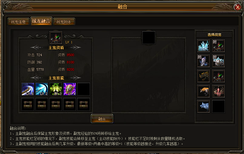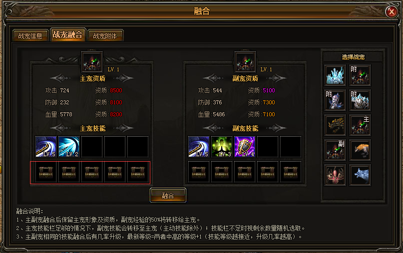 战宠技能栏可消耗金币进行解锁,融合后副宠消失技能可融合到主宠身上,有几率提升同等技能等级,。